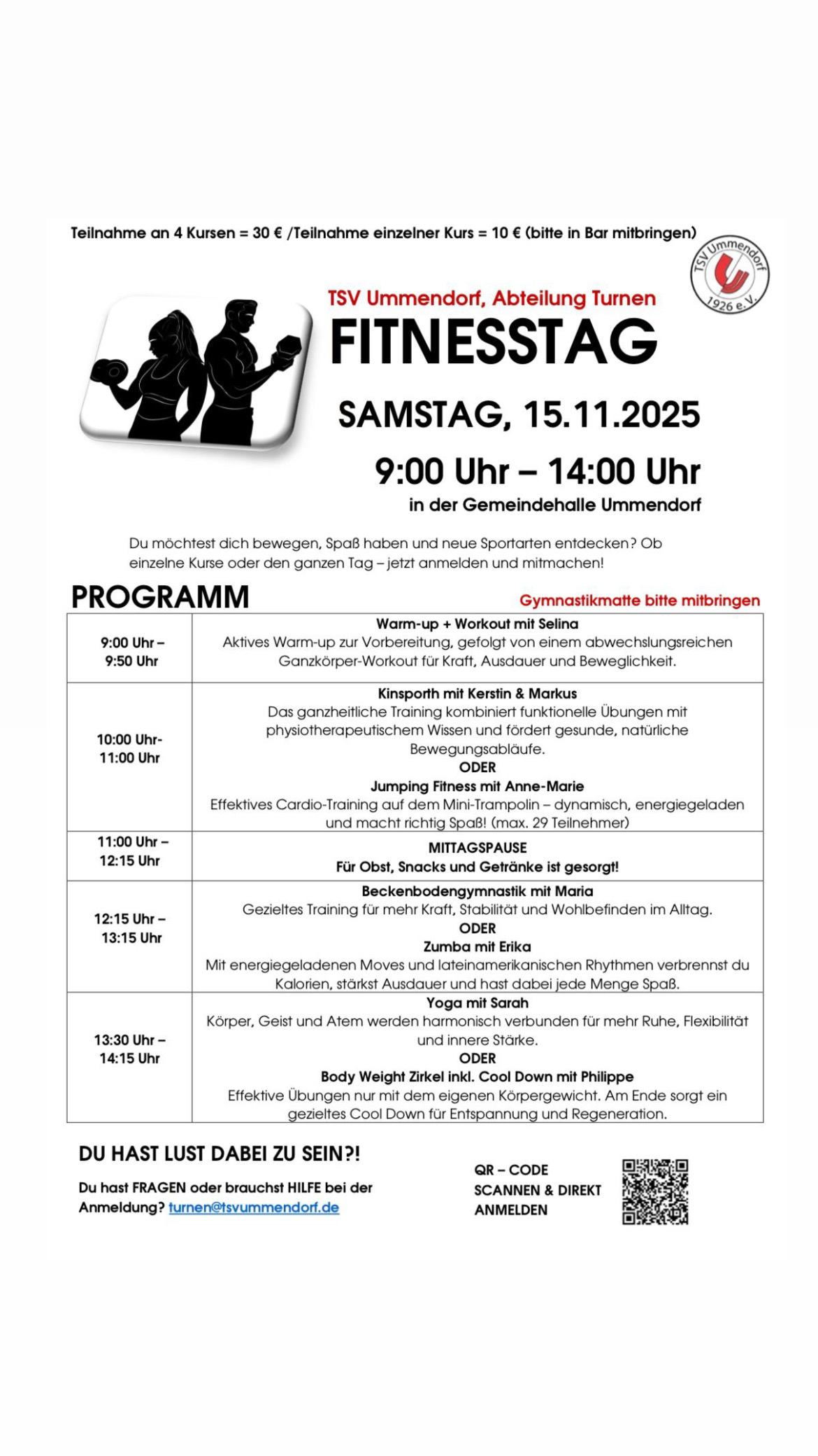 Mach dich bereit für einen sportlichen und energiegeladenen Tag! Am Samstag, 15. November 2025, findet in Ummendorf unser großer Fitnesstag statt- von 9:00 bis 14:15 Uhr heißt es: Bewegung, Motivation und jede Menge Spaß!